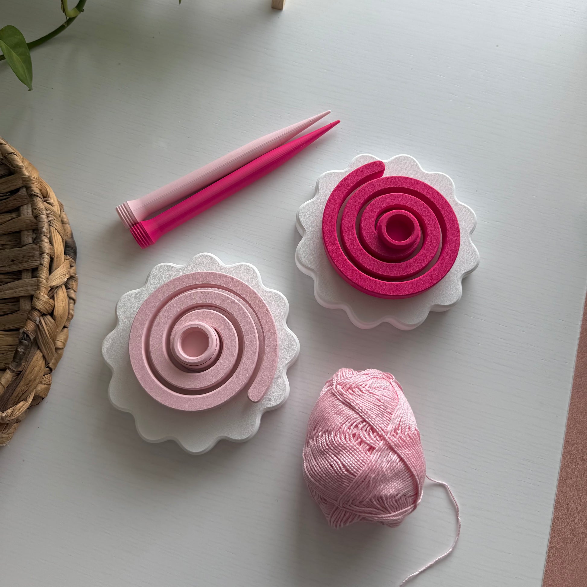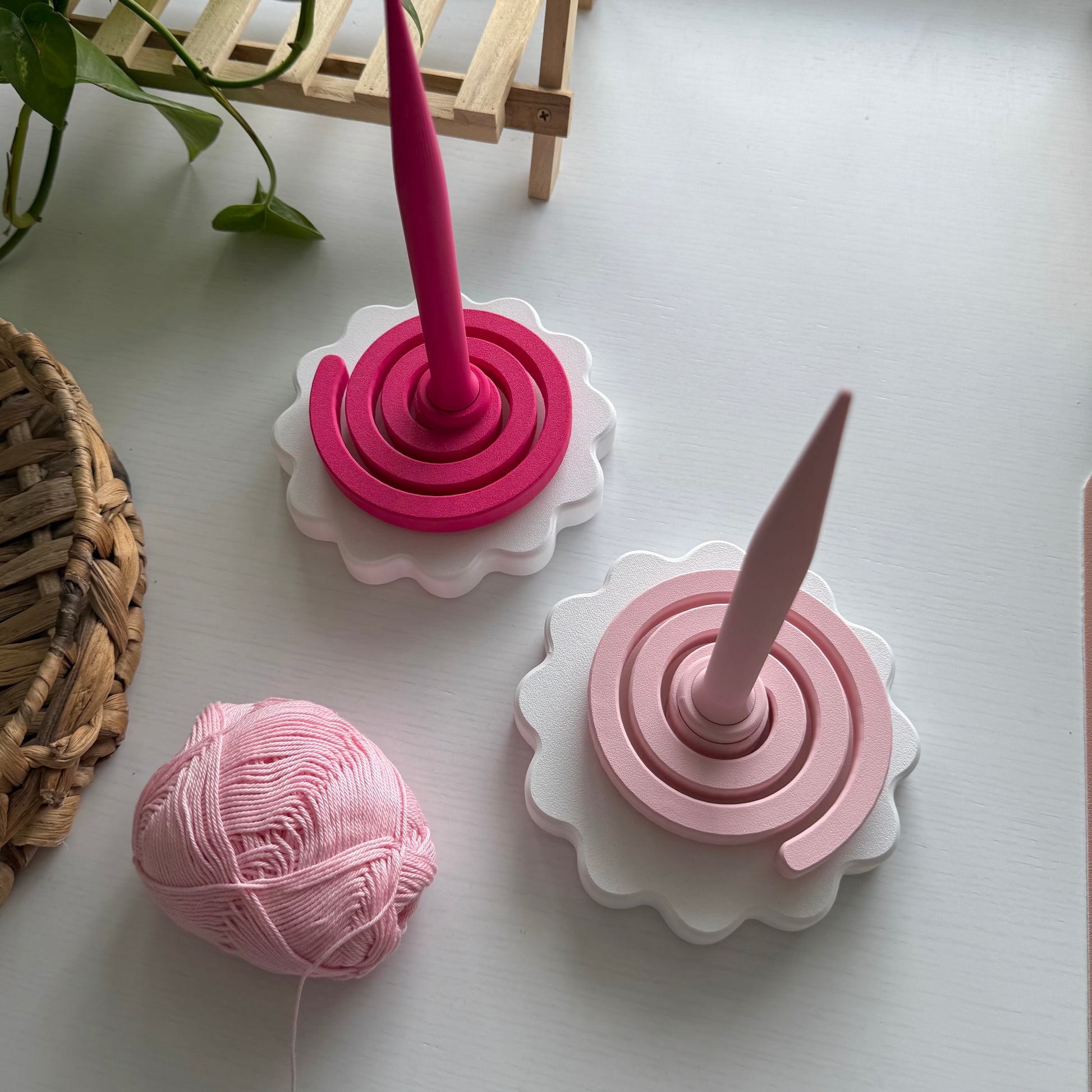 Our spinners are created to eliminate the constant need to pull on your yarn, allowing the thread to flow effortlessly into your hands. This consistency helps to maintain perfect tension without having to suffer with a center pull! Whether you're working with caked-up yarn, yarn skeins or donuts, our spinners work seamlessly.