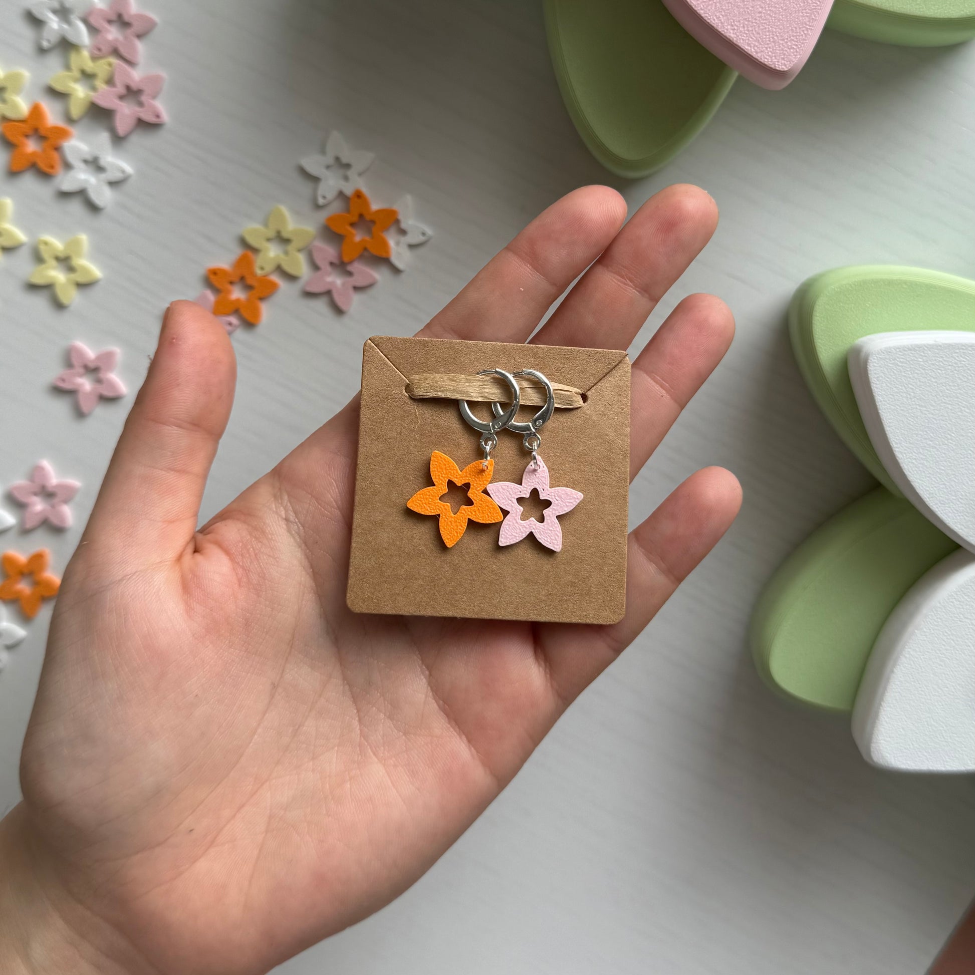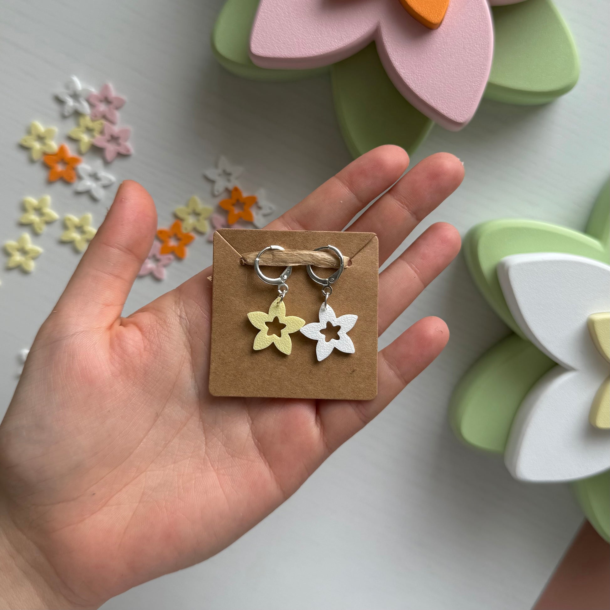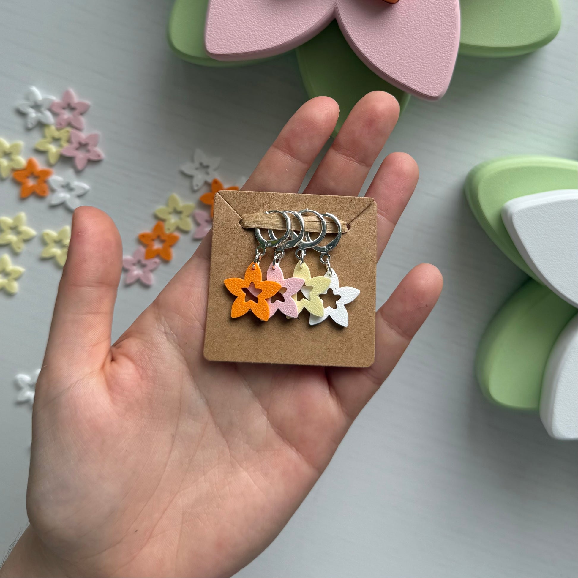 Adorable plumeria shaped stitch markers for fiber artists! One marker consists of a metal clasp and a plant-based plastic pendant.